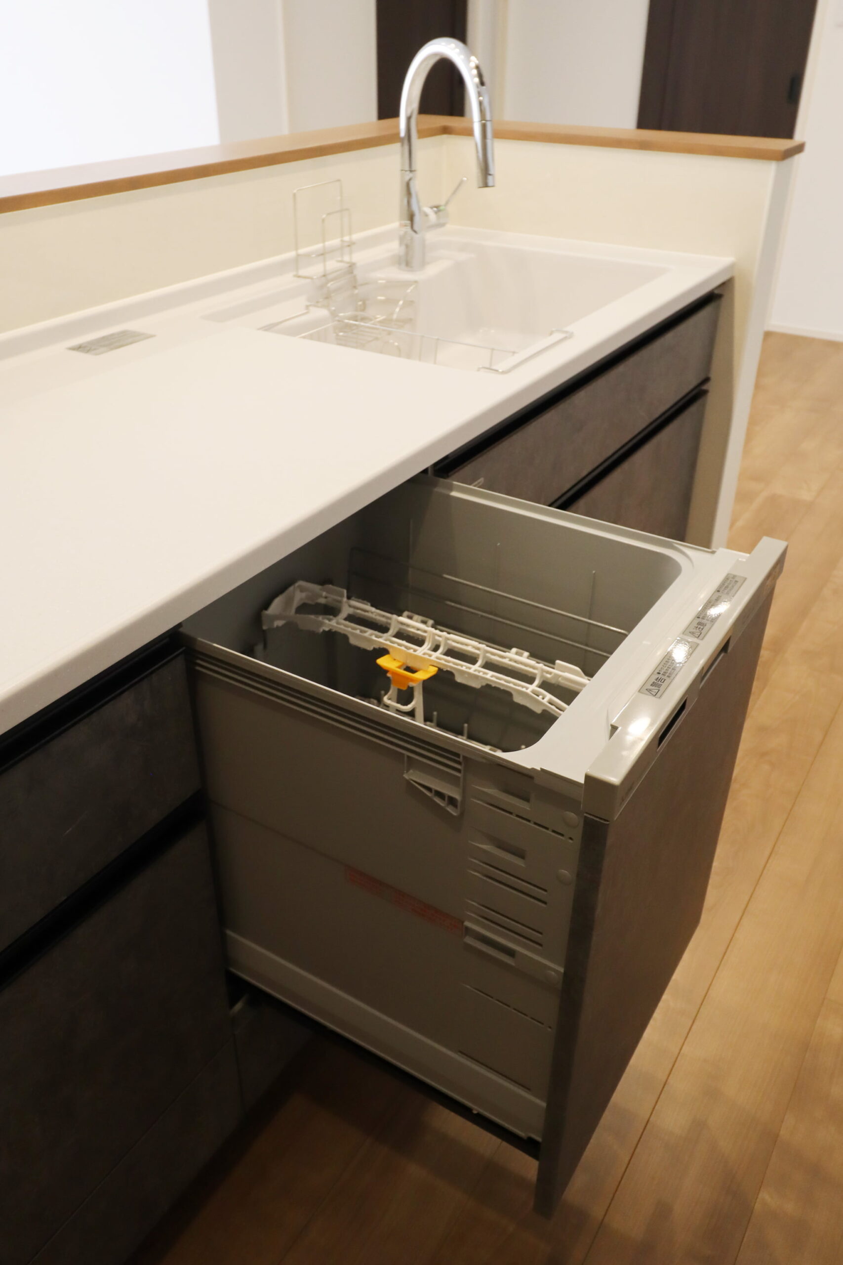 キッチンには、手をかざすだけで吐水・止水可能なタッチレス水栓、鍋やフライパンまでまとめて洗える深型食器洗い乾燥機を採用。