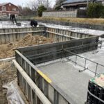 基礎の立ち上がりに化粧を施し、ポーチにタイルを貼っていきます。