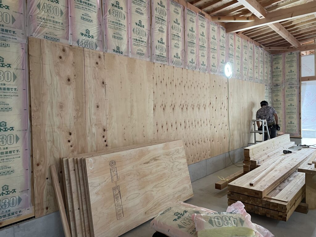 壁に断熱材を入れて、仕上げの合板材を張っています。