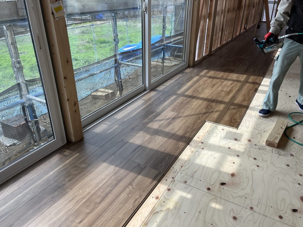 こんにちは、てぃーたです。山陽小野田市H様邸はフロア材を張っています。大人っぽい茶色の床です。