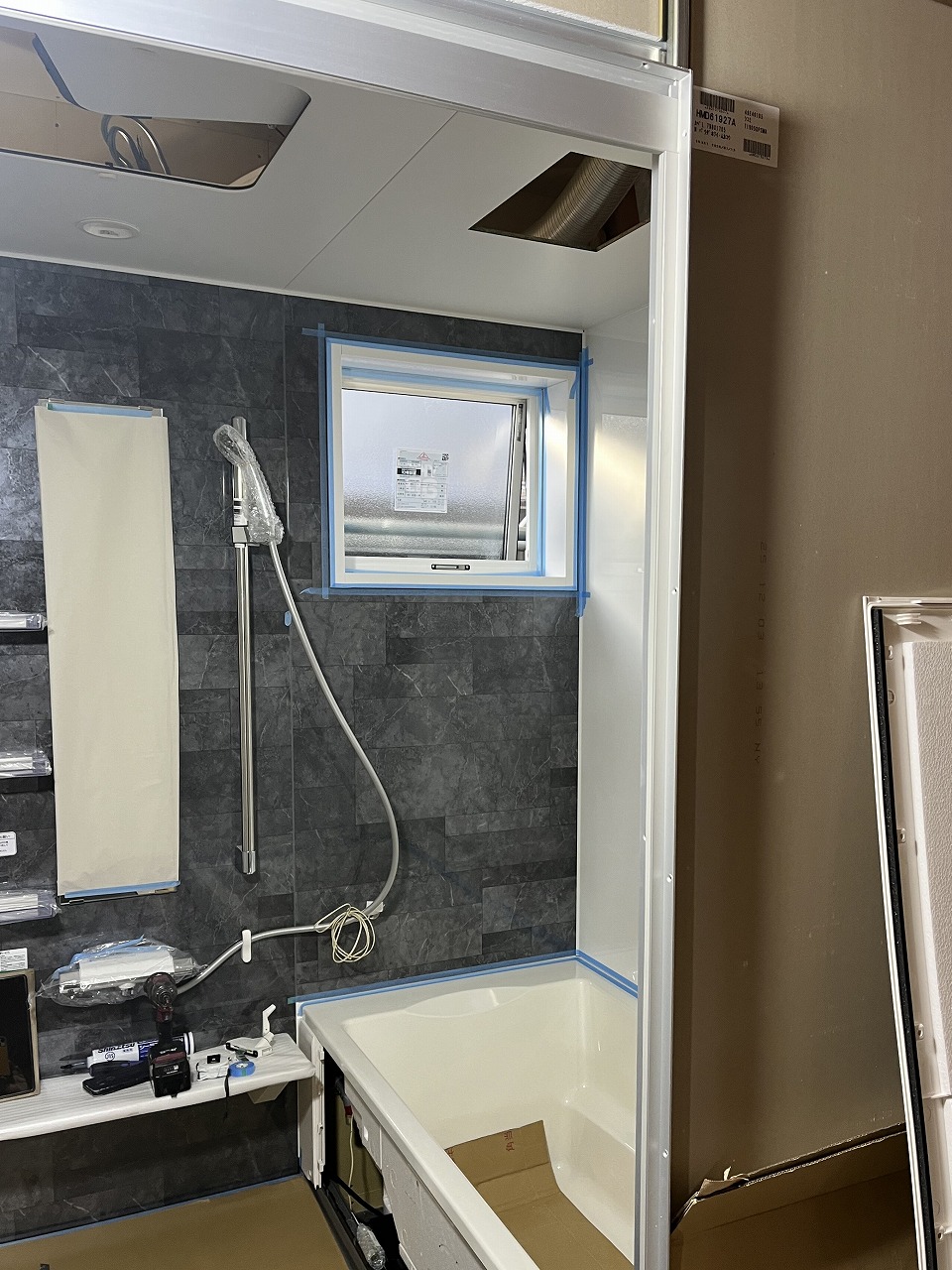 宇部市T様邸はユニットバスが設置されました。浴槽をセットしたら、壁や天井を組み立てます。