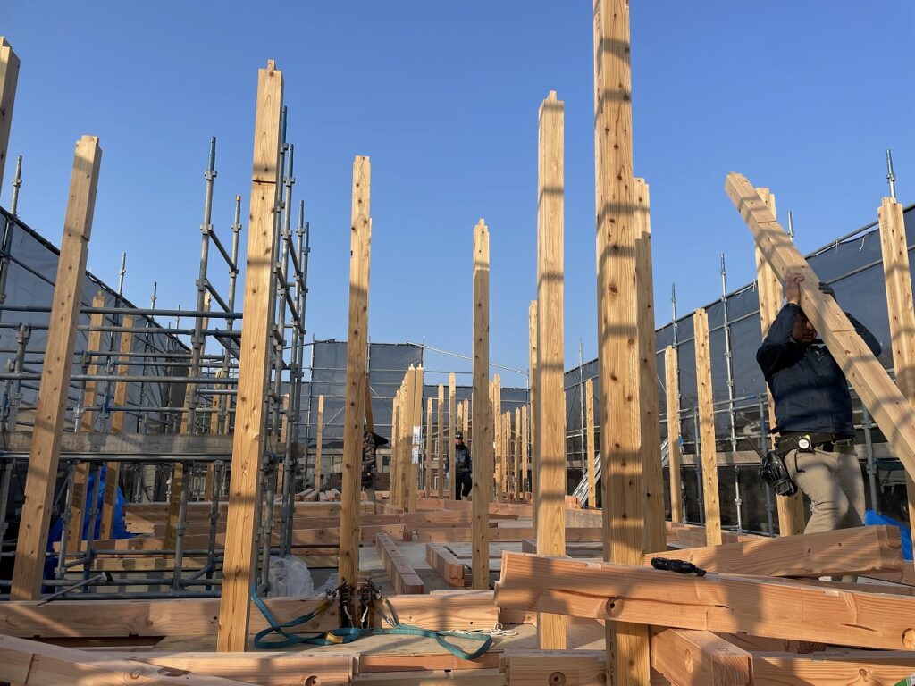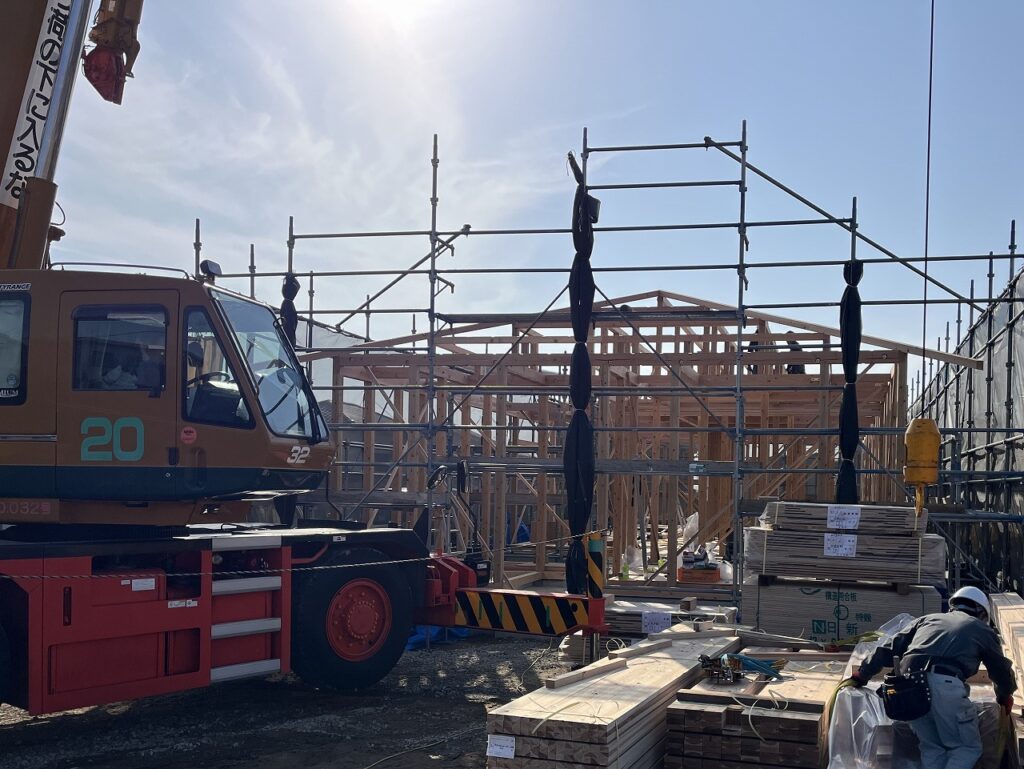 本日、山陽小野田市H様邸が上棟しました! 柱を1本1本、手作業で建てていくんですね。どんどん進む作業を見ていてワクワクしました。