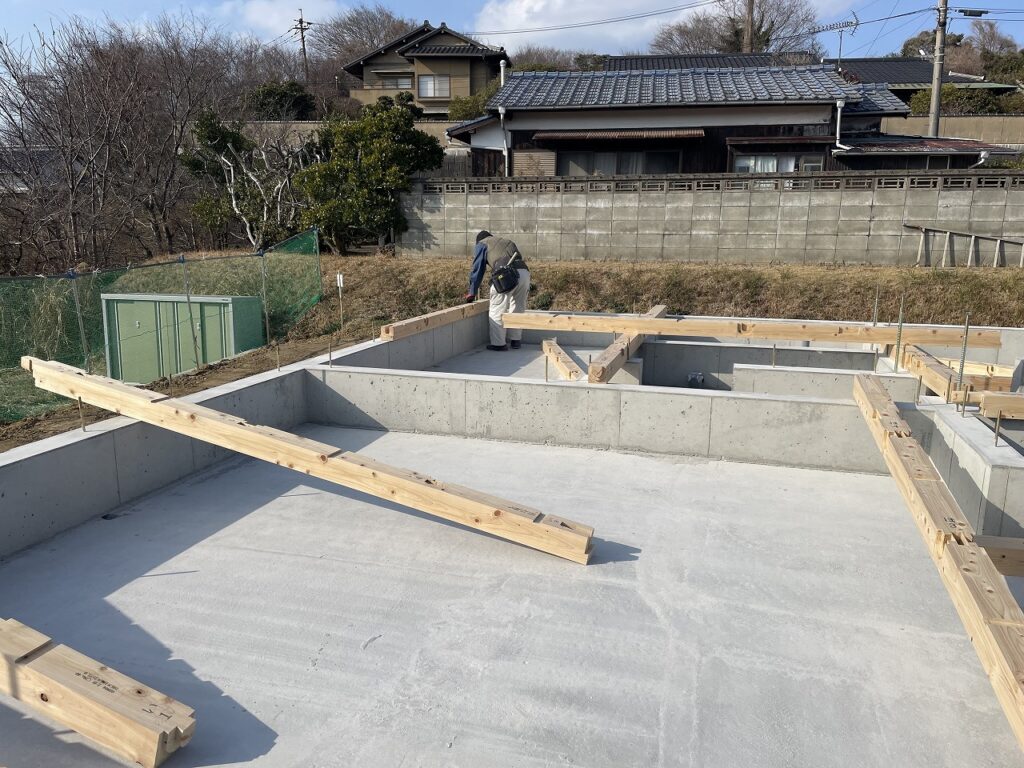 山陽小野田市H様邸です。大工さんが土台を加工して基礎に固定する土台敷きが始まりました。今日は春みたいに暖かくて作業がはかどりました。えーるパパでした。