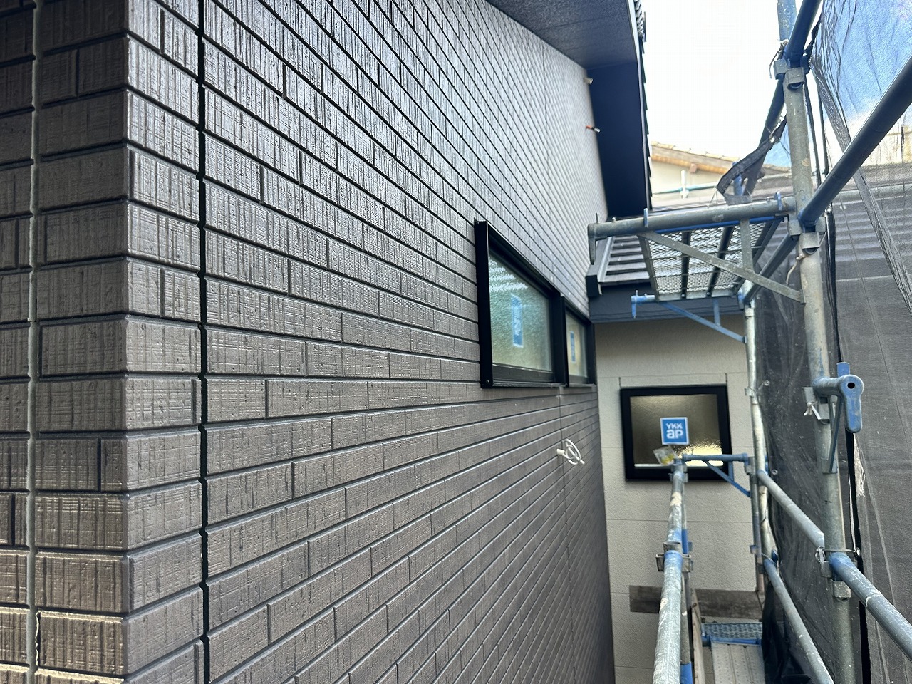 宇部市T様邸の外壁のサイディン材は、重厚感のあるタイル柄と玄関回りは明るいベージュ色です。