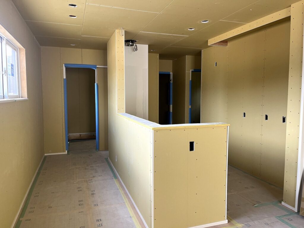 お家の中は、大工さんの造作工事が終わりました。クロスを貼ったらどんな雰囲気になるのか楽しみだなぁ。