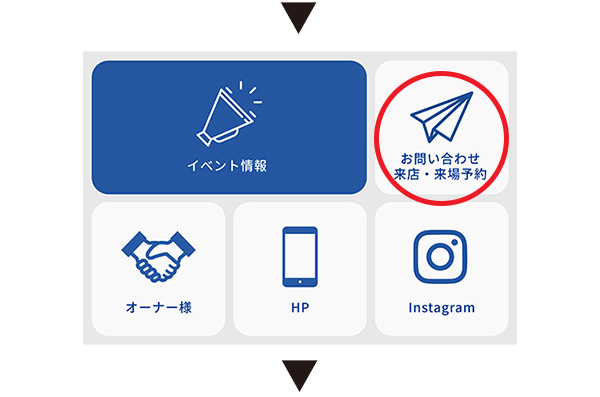 友だち追加後、メニューを開いて「お問い合わせ 来店・来場予約」ボタンをタップしてください。
