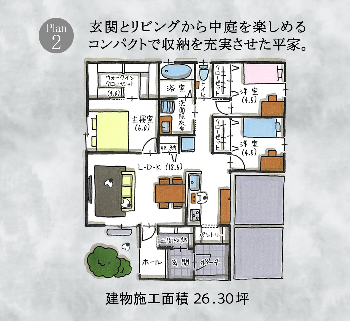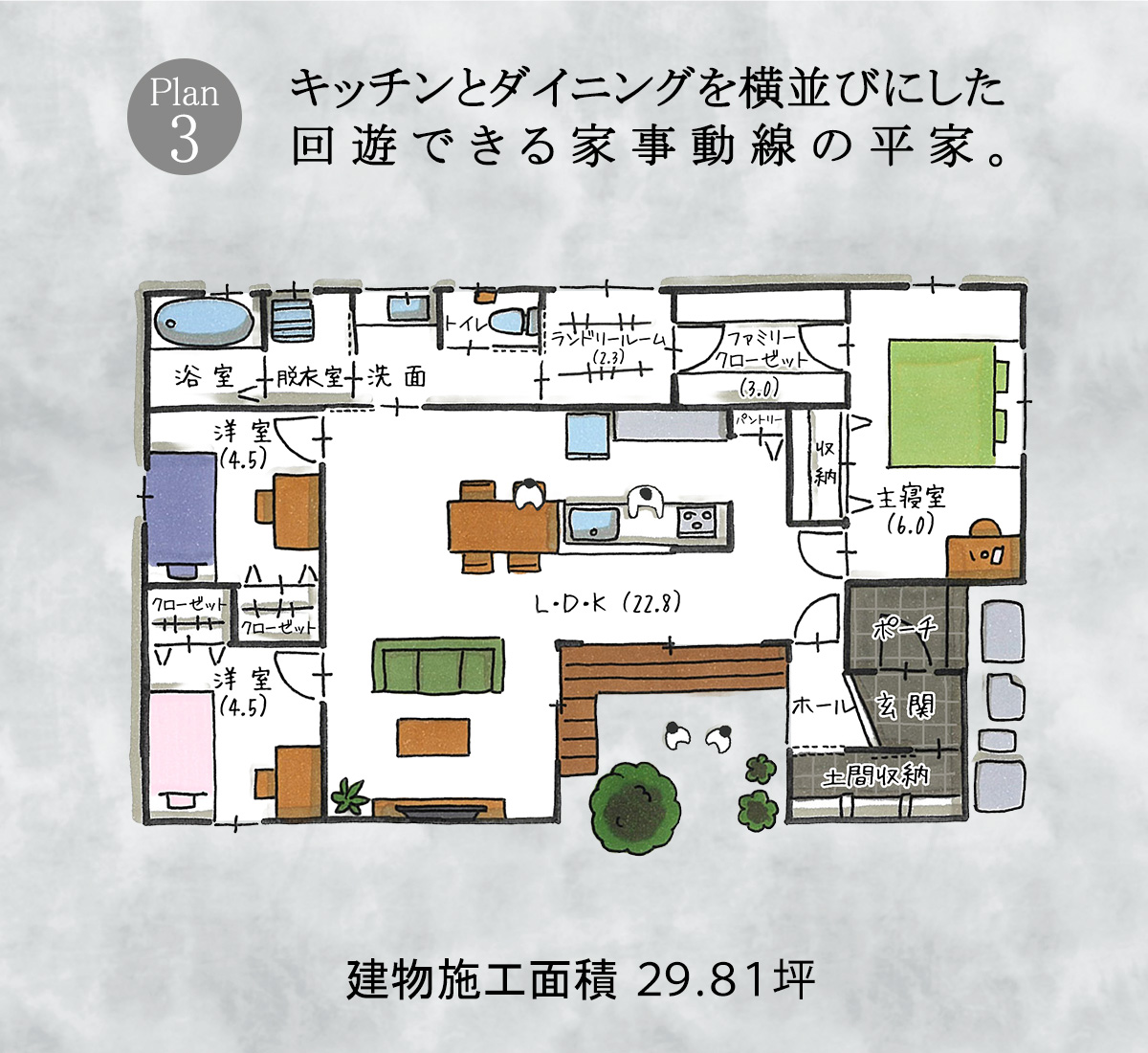 [ 新春マイホーム応援キャンペーン 限定6組「間取り」×「外観」 ]とは、エルティーエスの家づくりを、より多くの方々に広めていくことを趣旨として完成後、見学会場として2か月間お借りできることを条件としたモニター募集です。敷地に応じた間取り変更にも対応します。