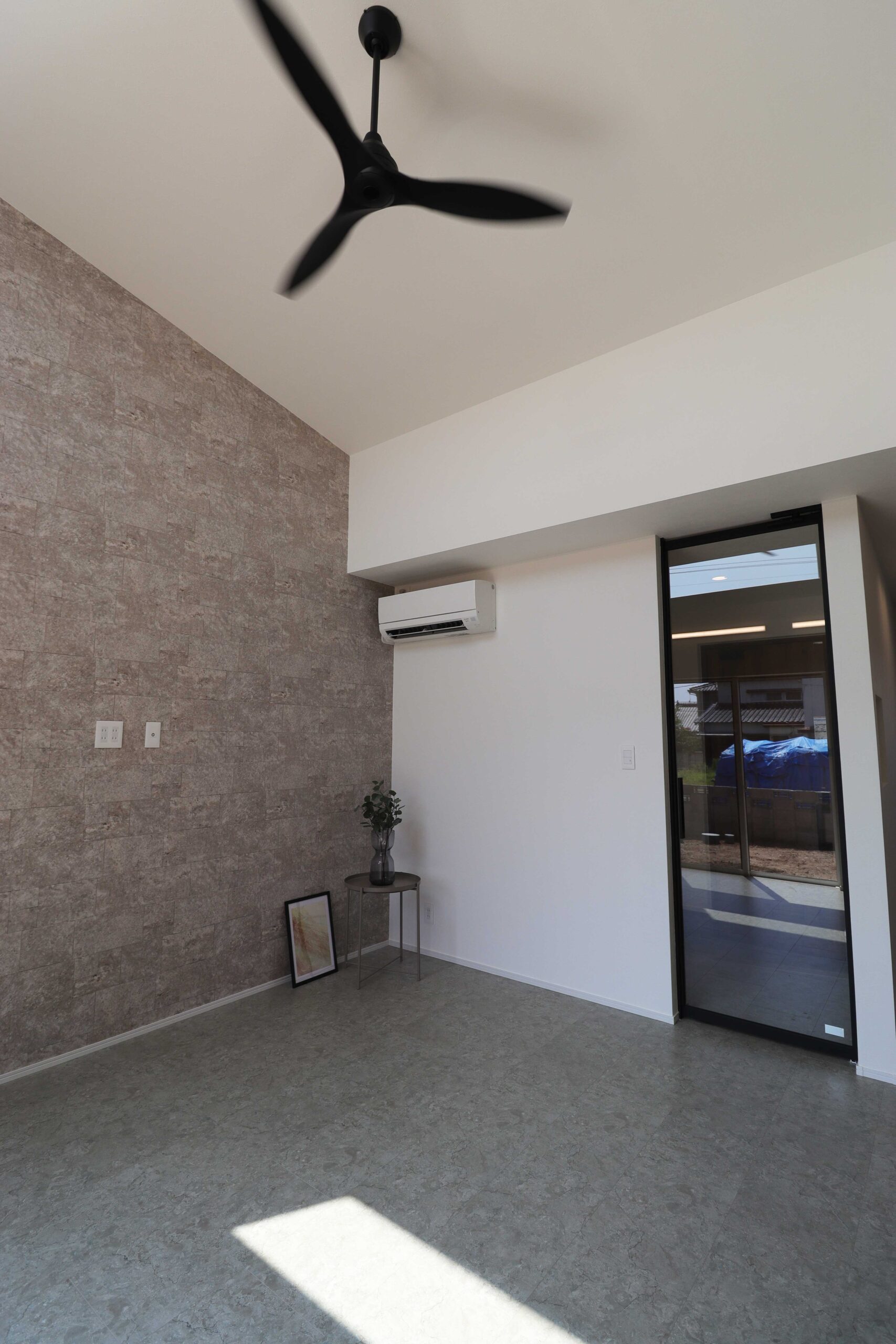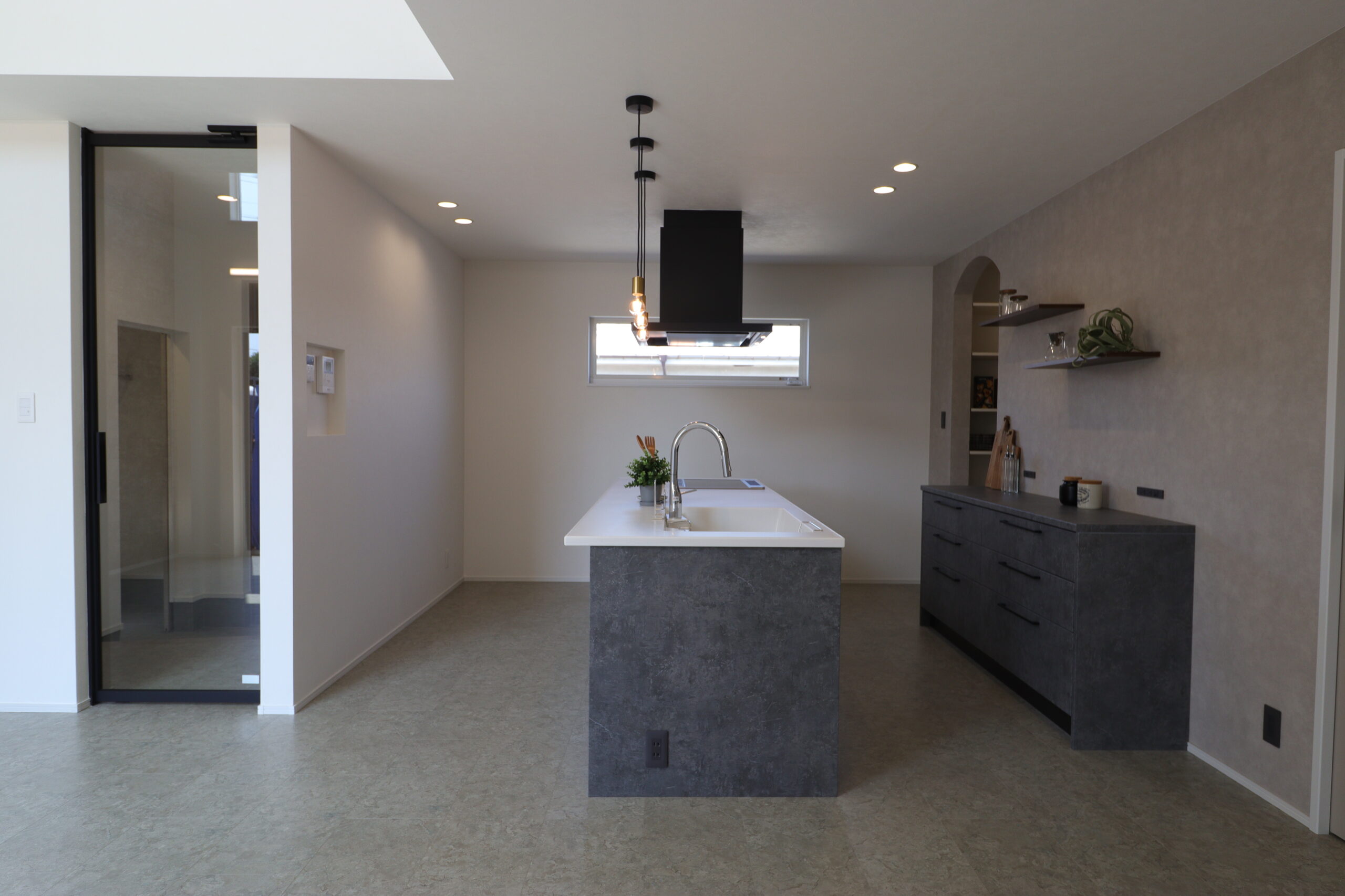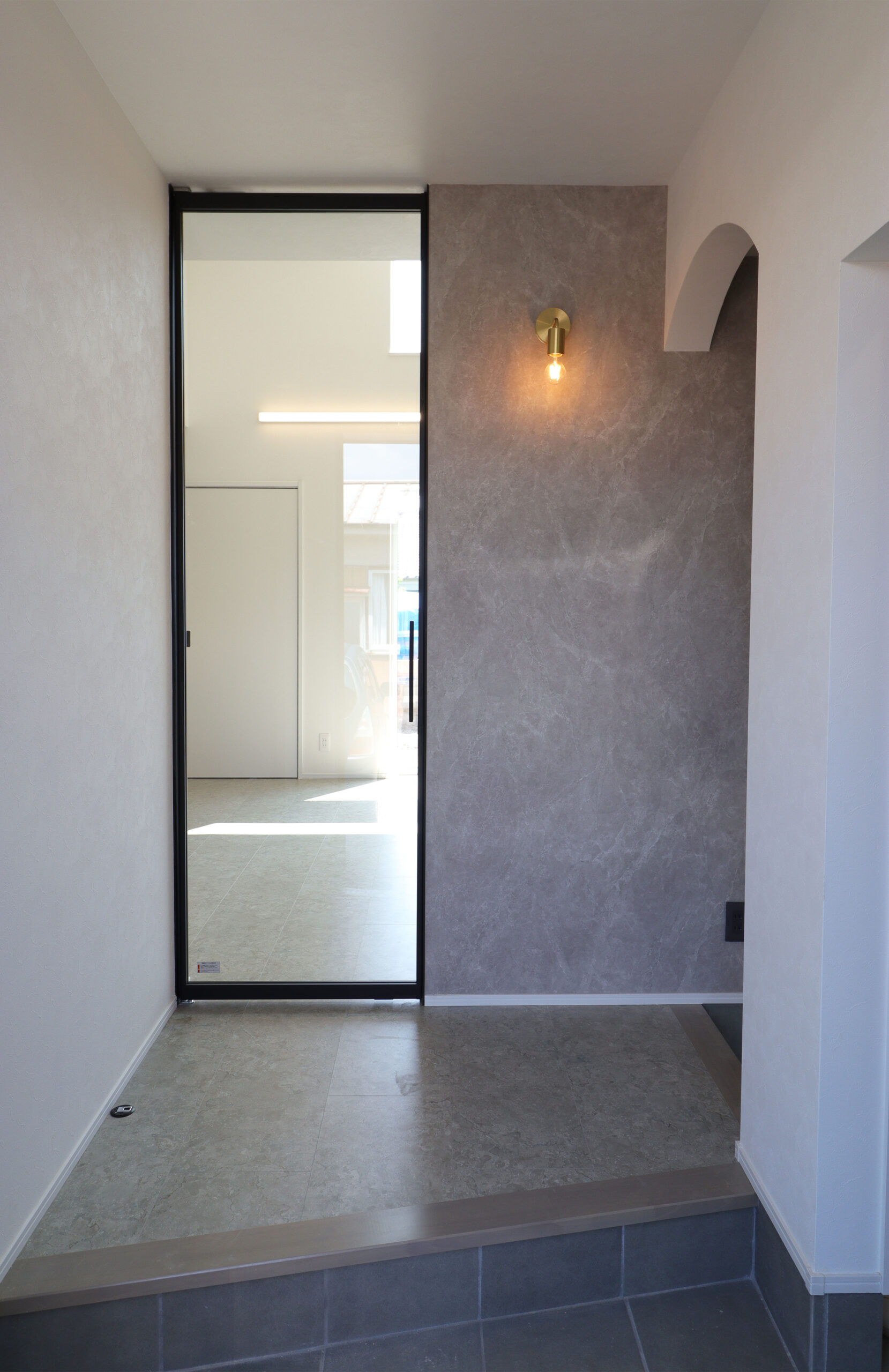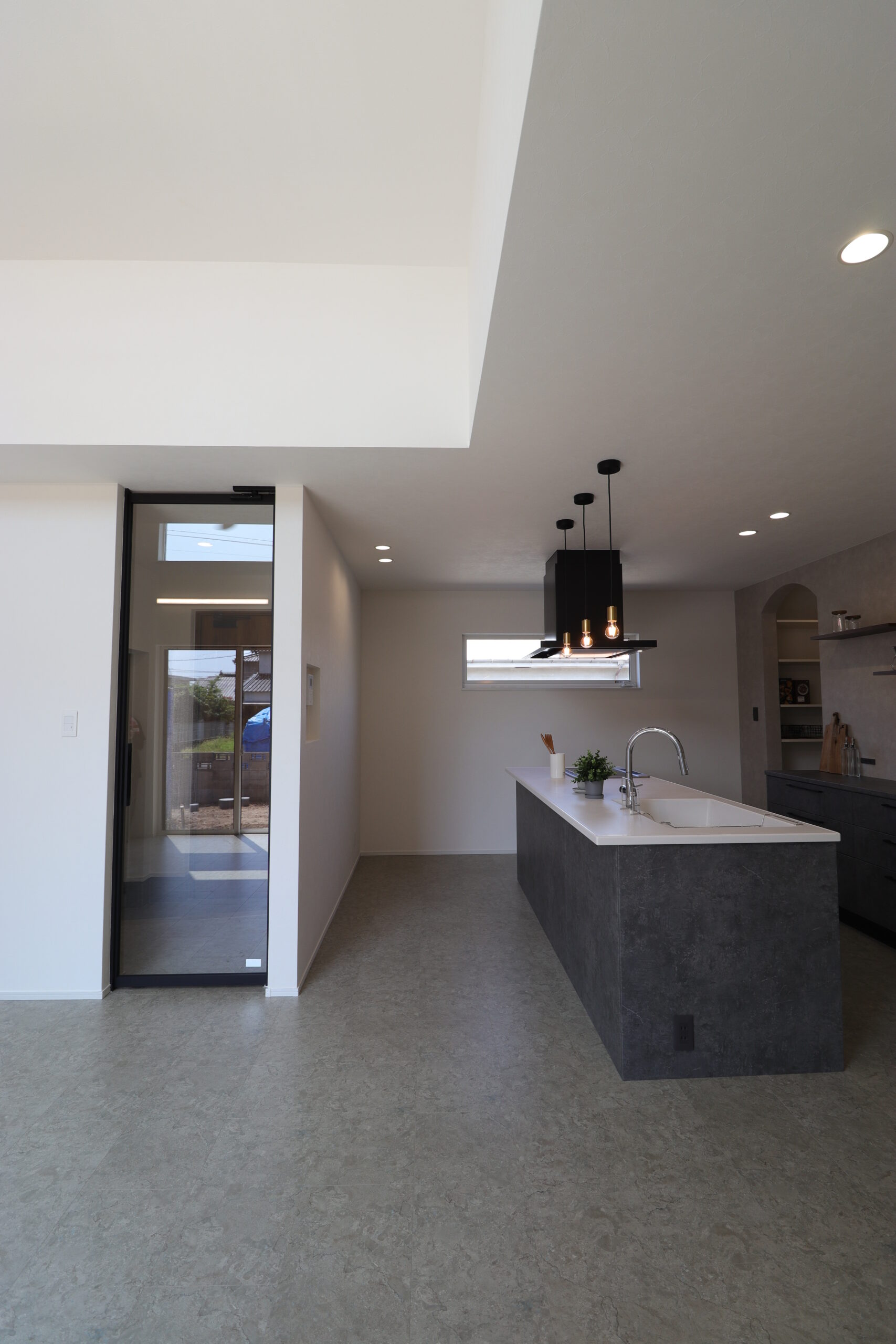 大理石調のフローリングやアルミフレームとガラスを組み合わせたドア、