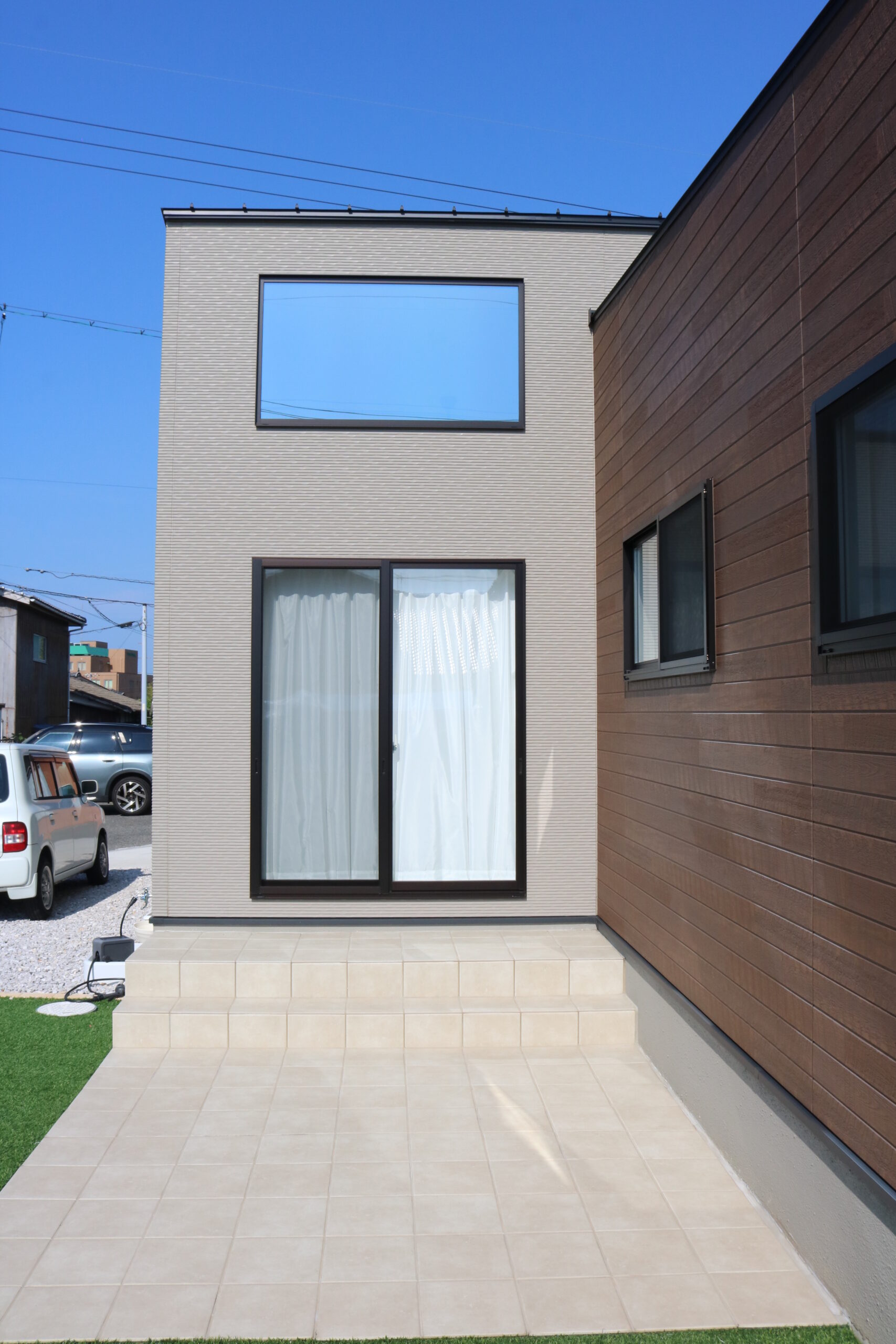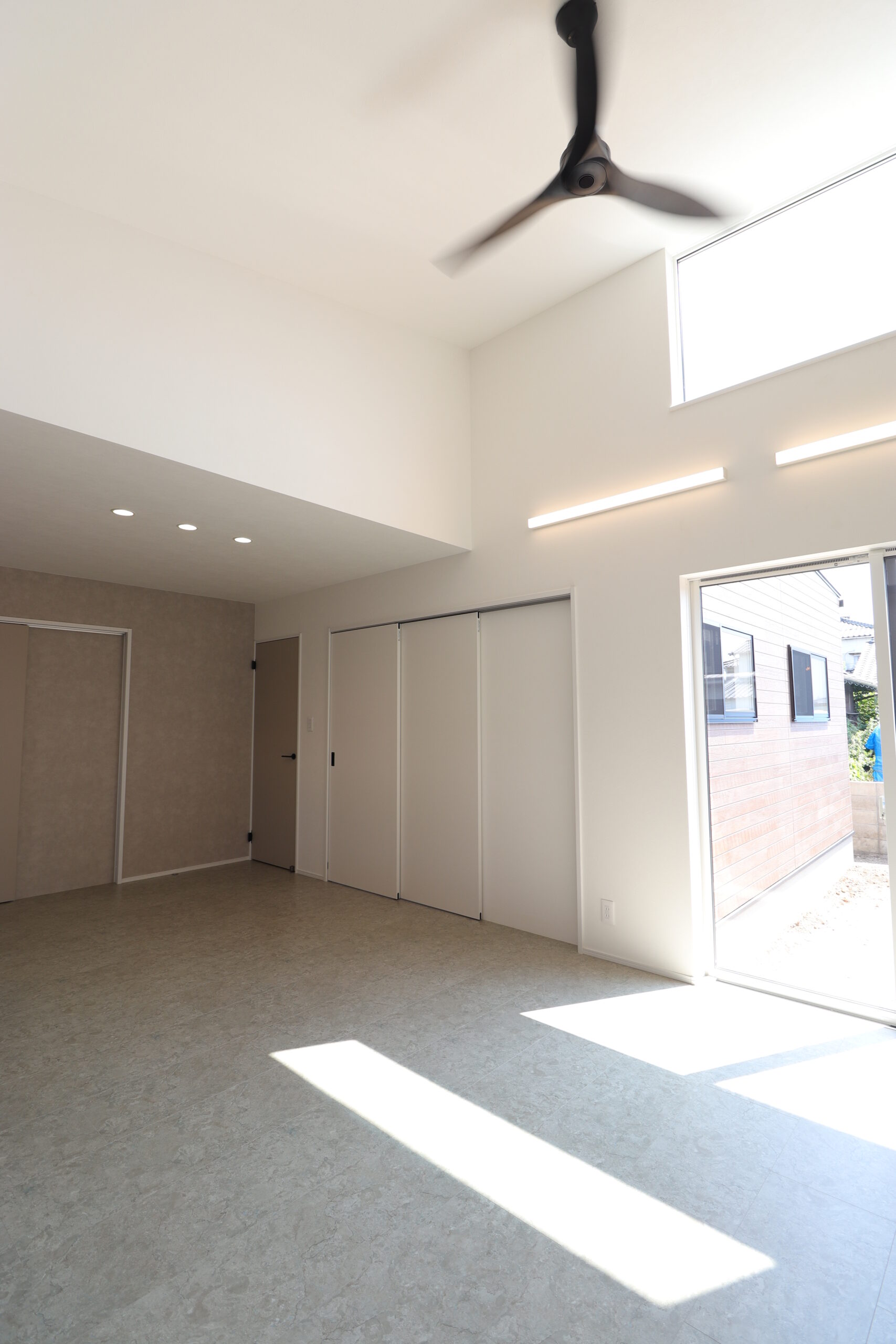 勾配天井リビングが特徴の平家で、天井いっぱいの高さに設置した窓からは
